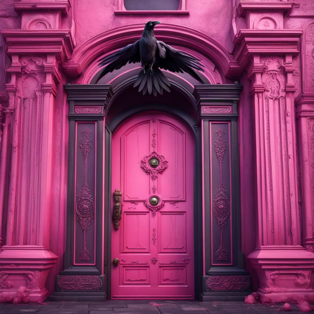 A detailed matte painting of a raven perched above a pink door. The image features deep colors and intricate details, reminiscent of fantasy concept art in 8k resolution.