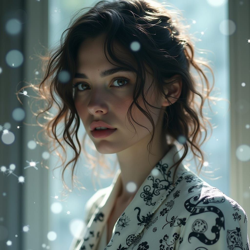 This image shows a brunette woman in painted attire, her hair wild, in soft light against sparkled glass. The image evokes a dreamy, surreal aesthetic with vibrant and mystical nuances.