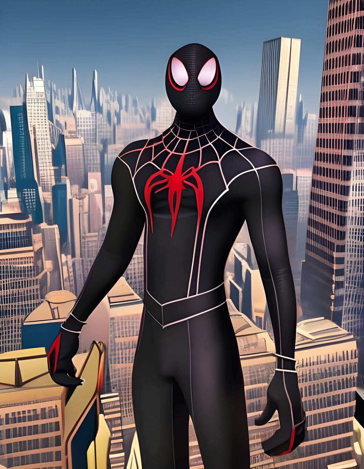 A detailed digital painting of Miles Morales as Spider-Man without his mask, set atop a New York City building. The image features deep colors and intricate details in a maximalist style.