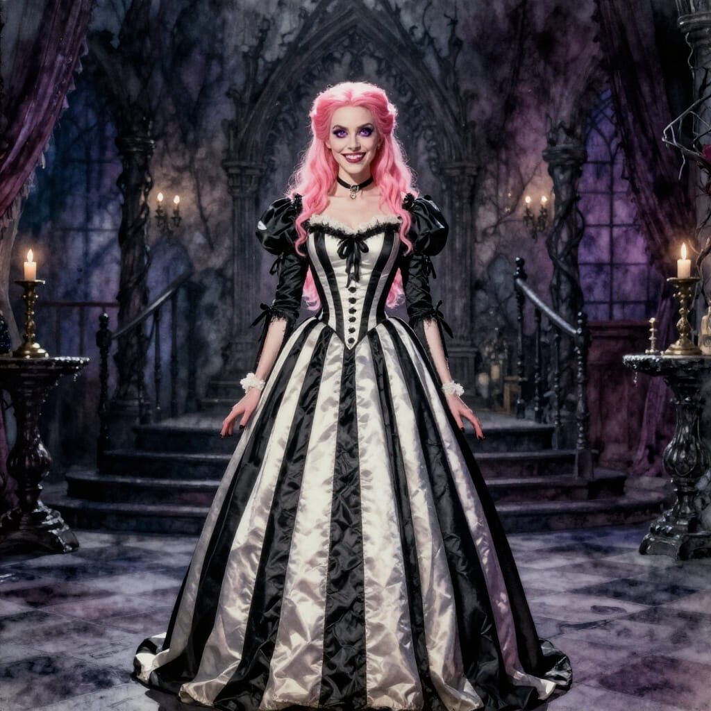 This image shows a striking woman with pink hair and a dramatic hourglass figure in a striped gown, set within a Gothic room. Rendered in a watercolor style with cinematic lighting.