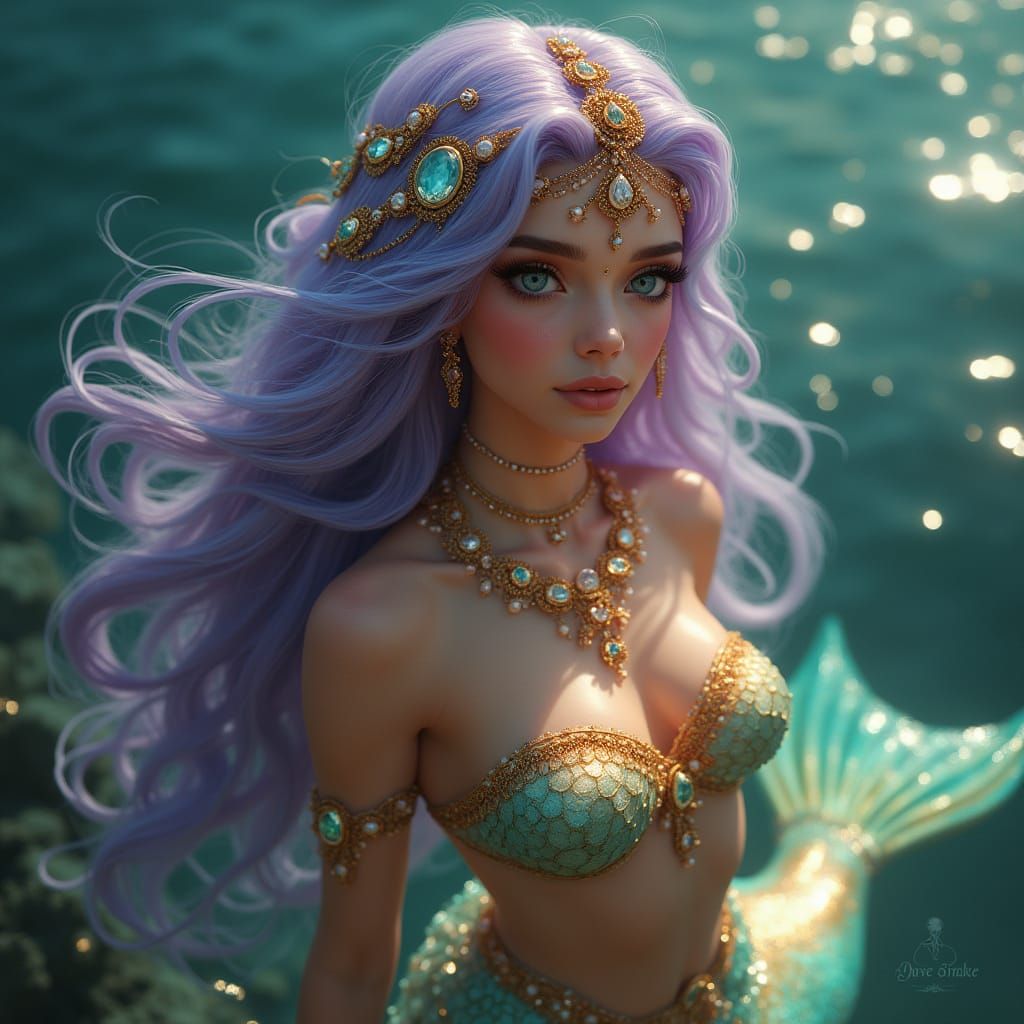 A stunning, high-definition image of a mermaid princess, adorned in oceanic jewels that refract light and shimmer against her luminous skin. Her long, flowing purple hair and opalescent tail evoke the shimmer of moonlit waves and tropical waters.