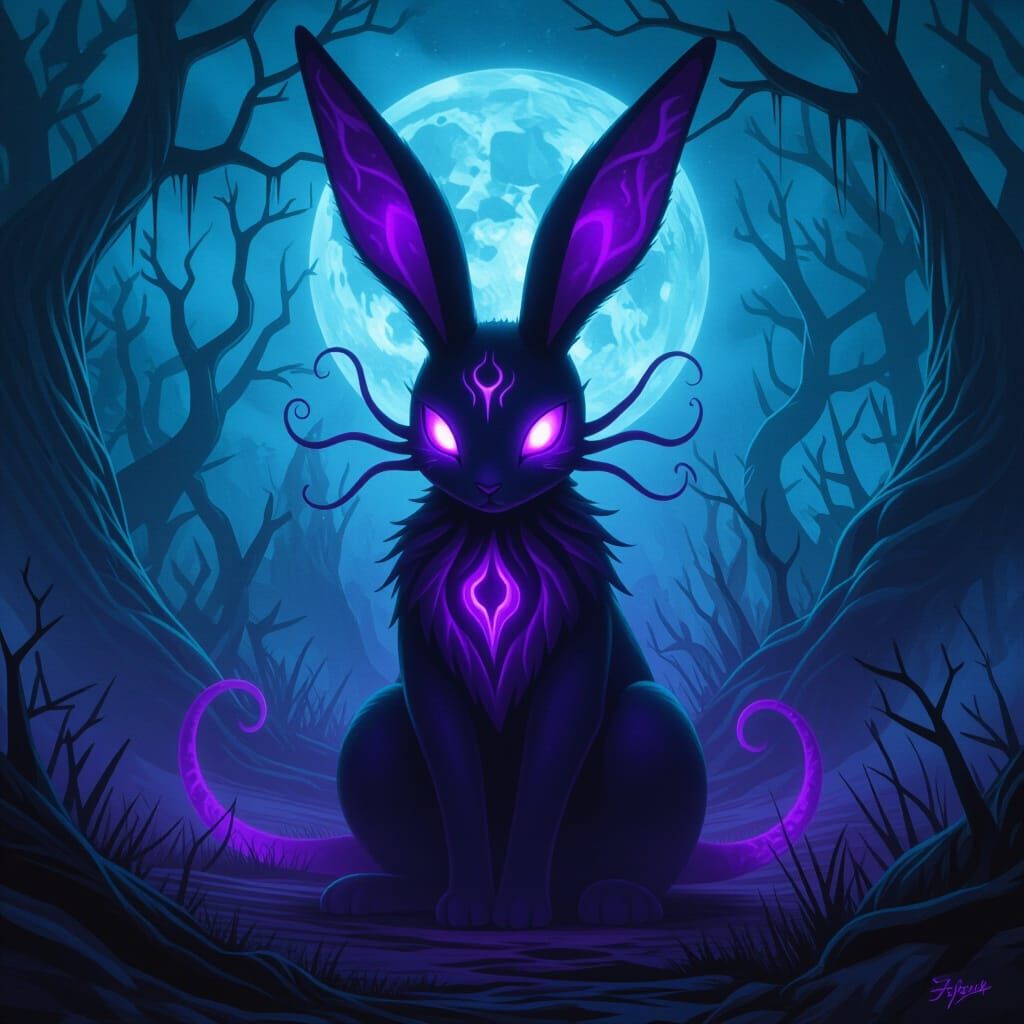 A terrifying, demonic Lopunny with otherworldly features, bathed in an eerie purple glow. This image captures a dark, mystical realm in a surreal, cosmic horror style.