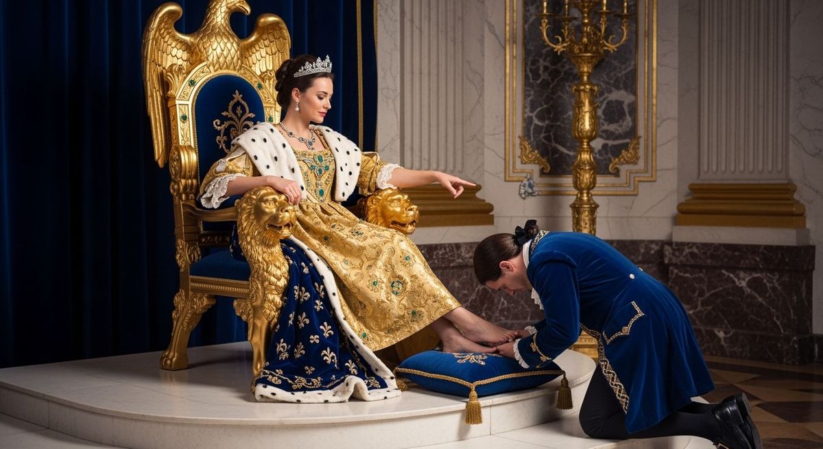 This image shows a French Empress in coronation robes seated barefoot on an ornate golden throne. A courtier bows at her feet in a luxurious palace, reminiscent of Versailles, captured with professional photography techniques.