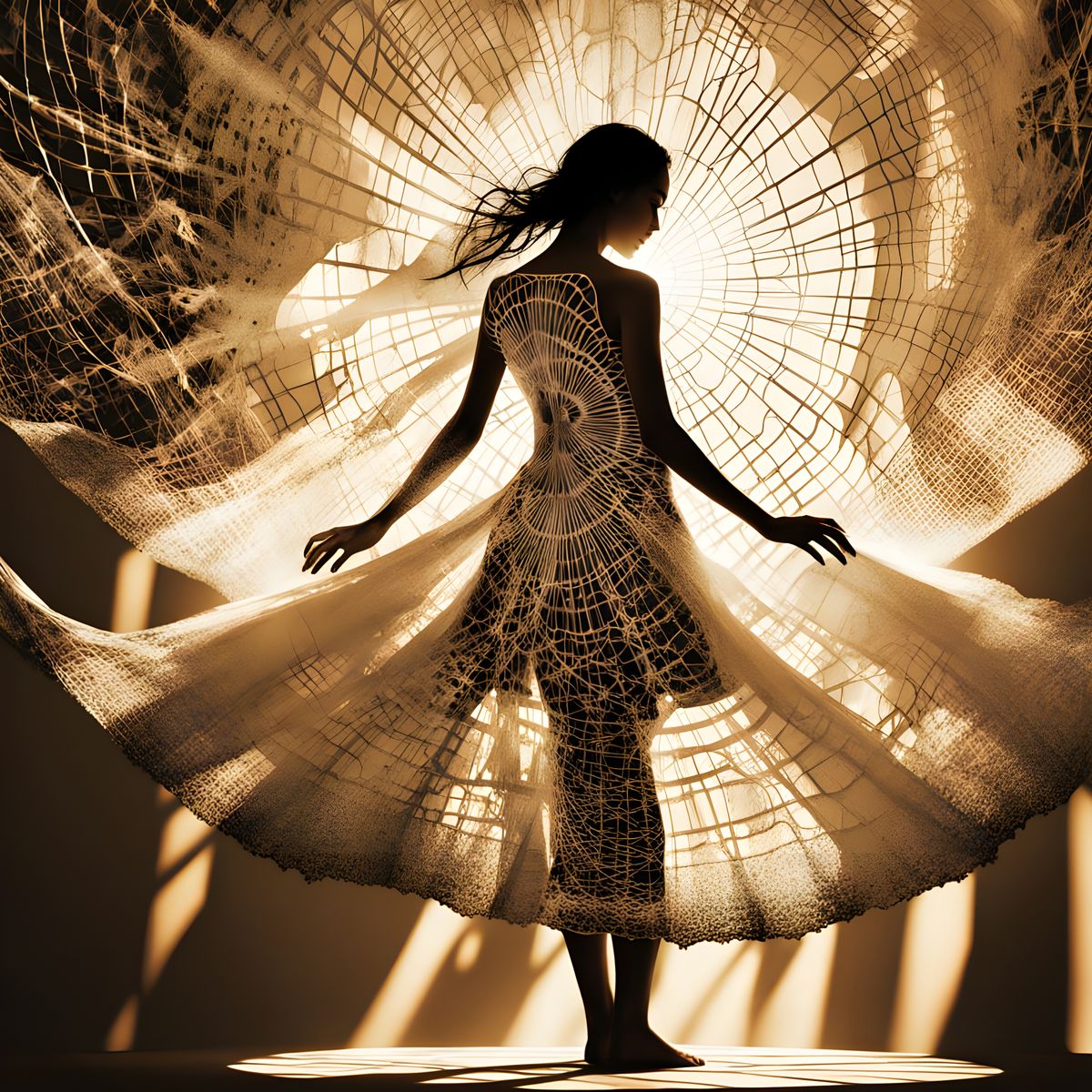 A surreal dreamscape of fractal light interference patterns overlaid on whitewashed sea cliffs. The image features intricate filigree, long shadows, and morphing grids, creating an ethereal and otherworldly scene.