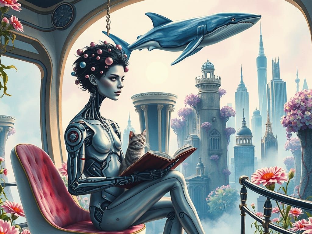 This watercolor painting shows a cyborg space captain reading a book next to a robot cat. The scene features soft, golden lighting and intricate details in a realistic style.
