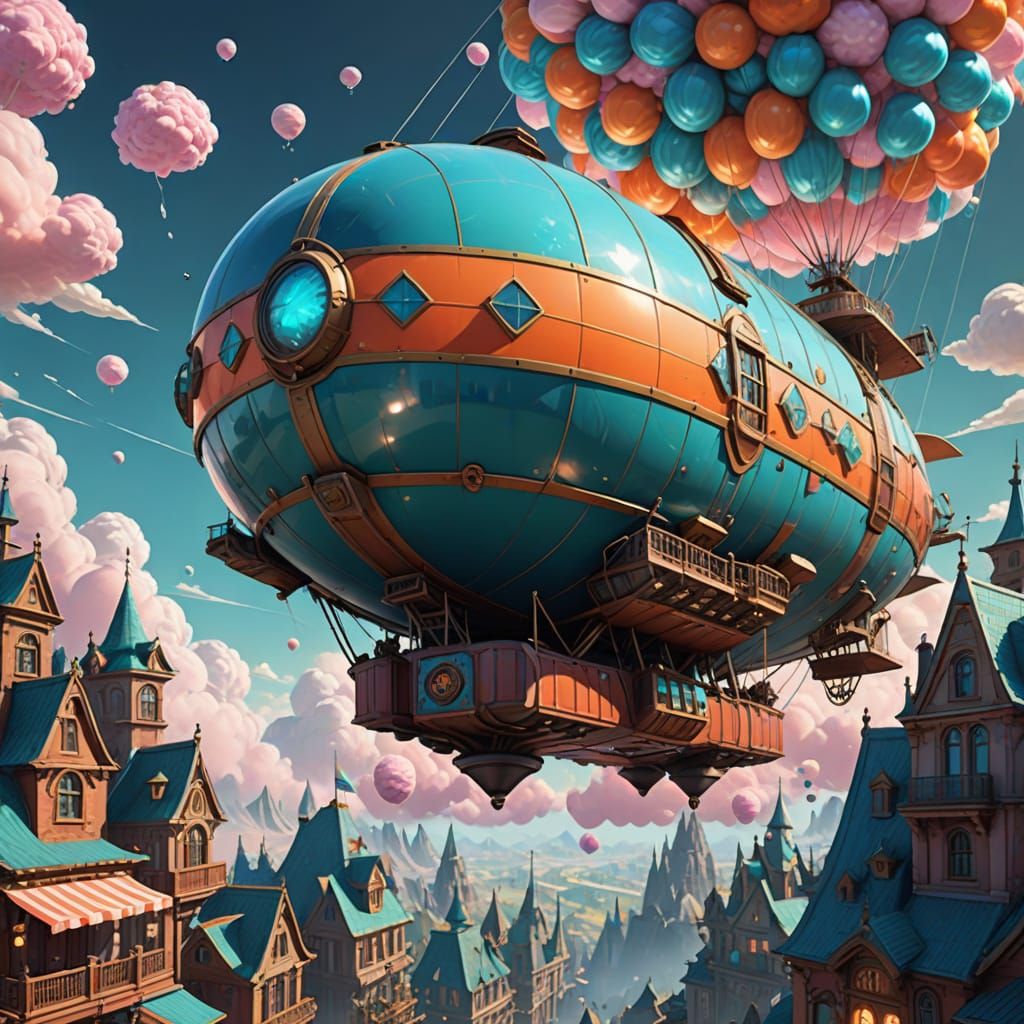 This image shows a cotton candy shop in an airship floating in the sky, reminiscent of retro futurism. The artwork features dynamic lighting, vibrant colors, and intricate details as 8k resolution concept art.