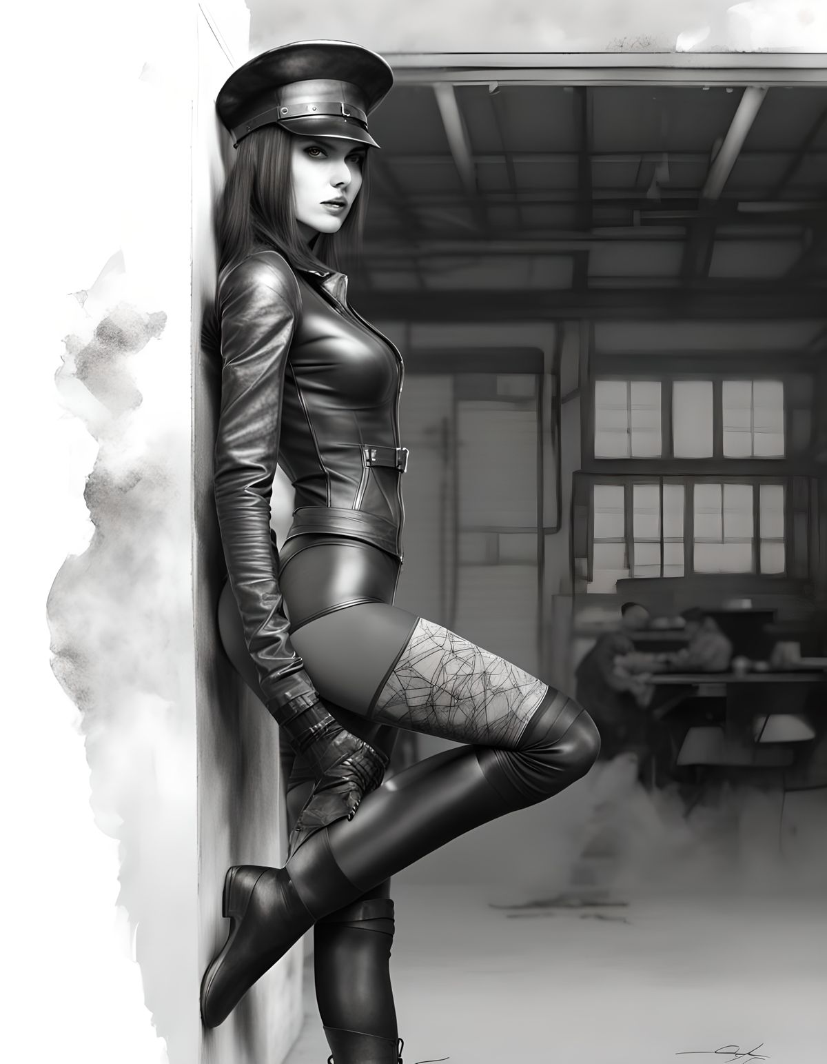 A striking charcoal sketch of a woman in a gothic military-inspired leather outfit, including a hat, jacket, leotard, and boots, leaning against a garage entrance.