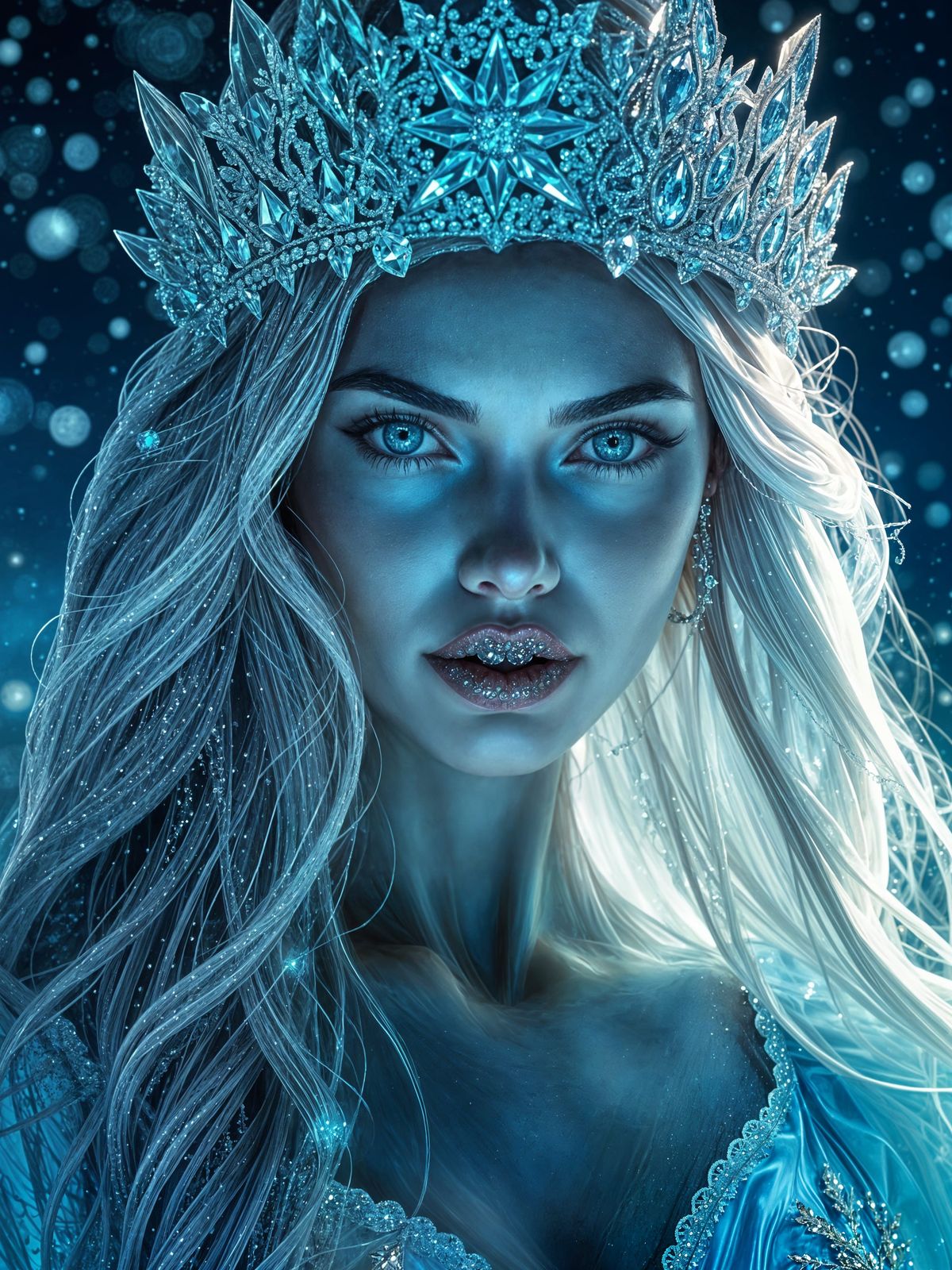 This enchanting image depicts a stunning woman with porcelain skin, sparkling eyes, and mesmerizing lips, adorned in a flowing, crystal-encrusted gown amidst swirling brown fog. Her long, silver hair flows in the wind, as she exudes confidence and mystery in a mystical, icy atmosphere.