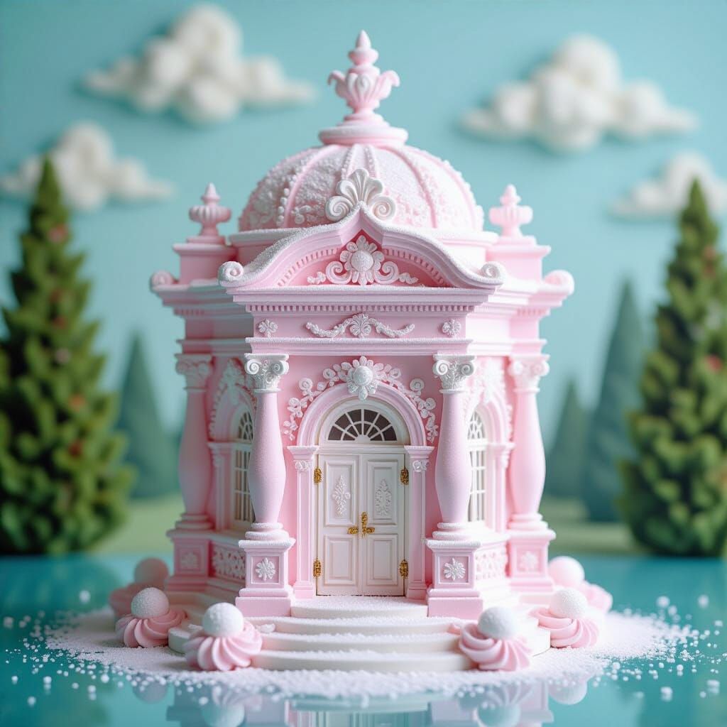 This image depicts a fantastical Rococo-style mausoleum constructed entirely from sweets and sugar. It's a surreal and detailed architectural confection.