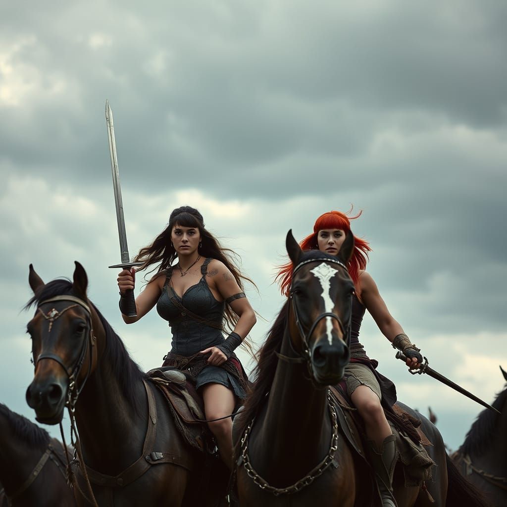 A cinematic still of two powerful warrior women on horseback. They are depicted with blood-smeared swords and determined expressions, set against a dramatic sky. The image has a gritty, film-like aesthetic.