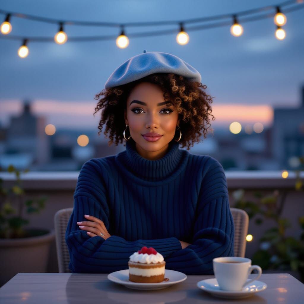 This image shows a light brown-skinned woman at a rooftop table, bathed in string lights. She's captured in a style reminiscent of expressive brushstrokes and an intimate atmosphere.