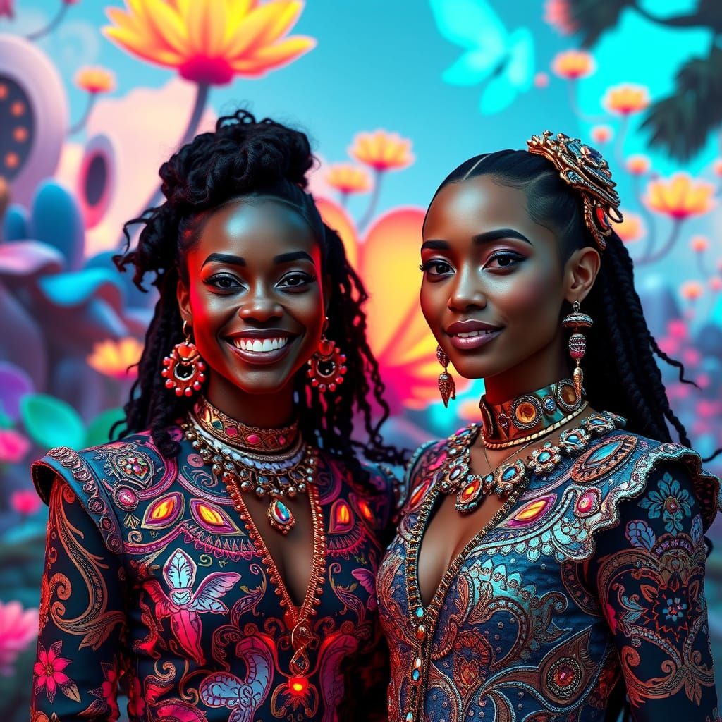 A striking picture of two women in elaborate futuristic streetwear. They stand side-by-side amidst surreal flora and fauna, with a photo-realistic quality and neon accents, in a Takashi Murakami-inspired aesthetic.
