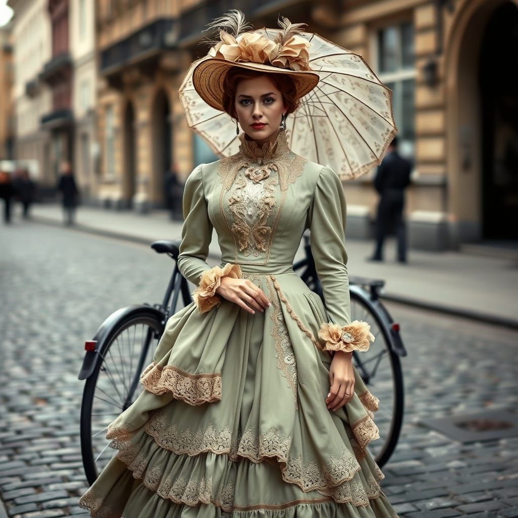 This image shows a Victorian-era woman in elegant street fashion, photographed on a cobblestone street. She wears an ornate dress in light green and beige, complemented by a feathered hat.