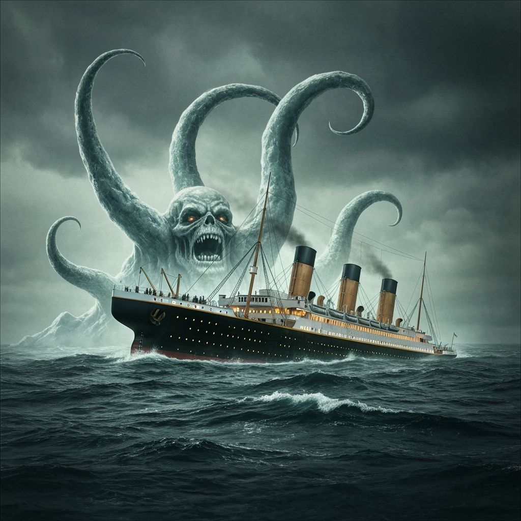 A vintage, photorealistic image depicts the RMS Titanic entangled by a monstrous, eldritch iceberg with icy tentacles in dark Atlantic waters. The scene evokes dread and doom with an eerie glow.