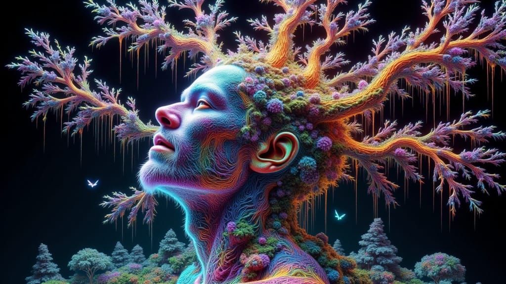 A striking image of a Japanese garden inside a crystal, featuring x-ray art and symmetrical anatomy. The image blends gothic and biomechanical elements with vibrant rainbow colors in a fantasy dreamscape.
