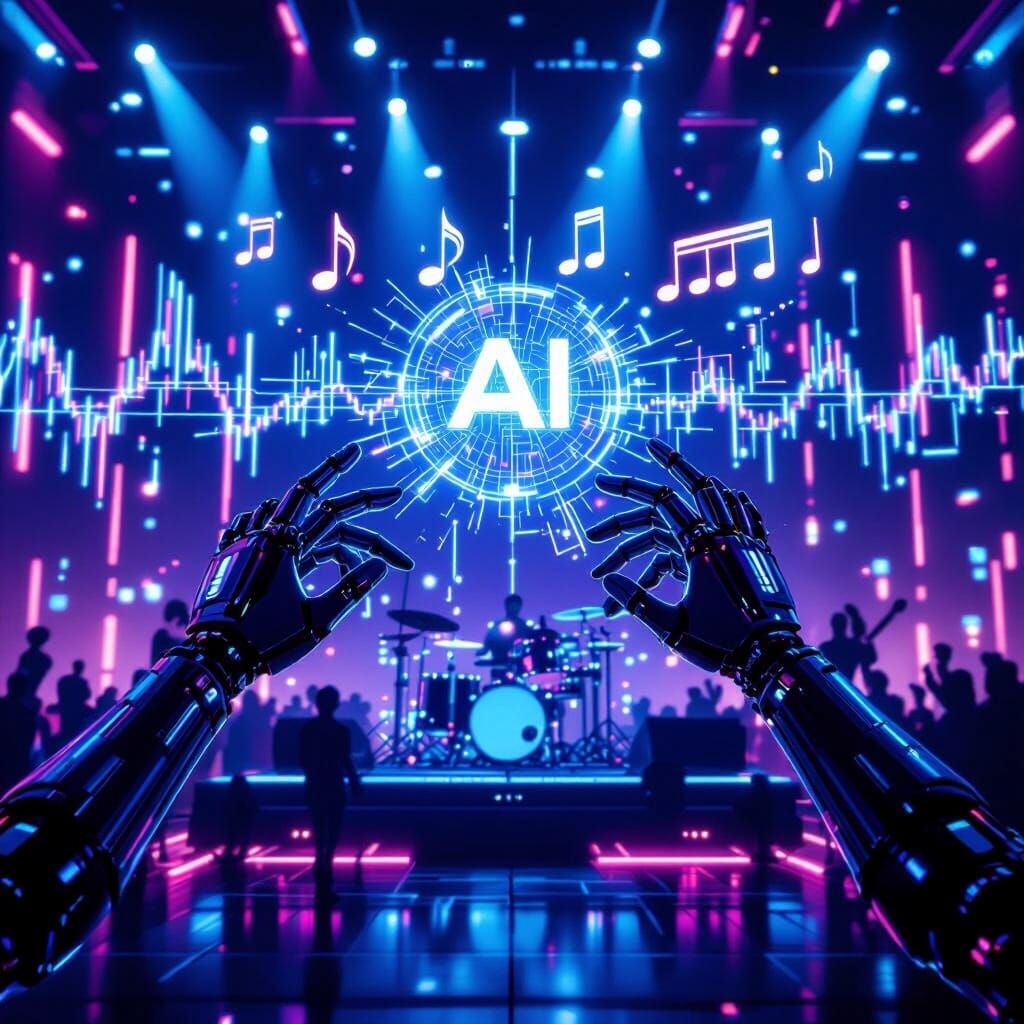 This image shows a futuristic concert stage with robotic musicians. Holographic notes and sound waves connect to a central AI brain, all rendered in a cyberpunk aesthetic.