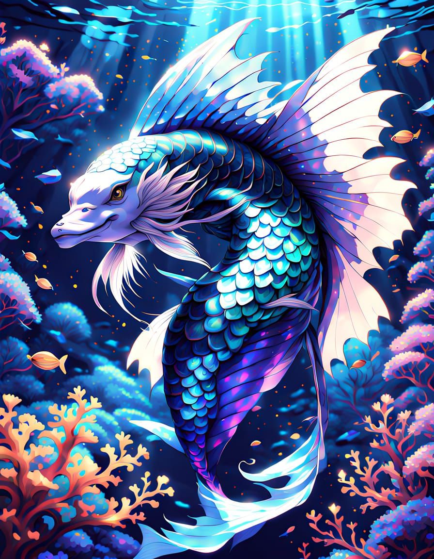 This image shows an anime-style deep-sea siren with glowing scales gliding through a dark abyss. It features vibrant, ethereal underwater art with aqua highlights and intricate detail.