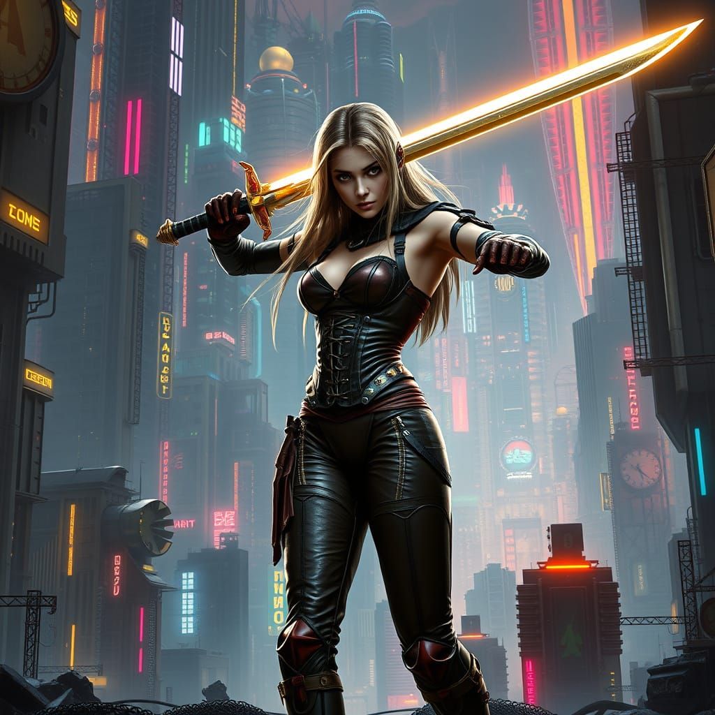 This image depicts a female cosmonaut in a futuristic, steampunk-inspired setting, wielding a radiant sword amidst a dystopian cityscape with neon lights and dramatic atmosphere, blending elements of Syd Mead and H.R. Giger's styles.