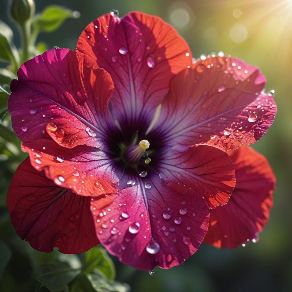 A close-up macro photograph of a vibrant petunia covered in glistening dewdrops, illuminated by soft, warm morning light. The image has a vivid and colorful style reminiscent of a painting.