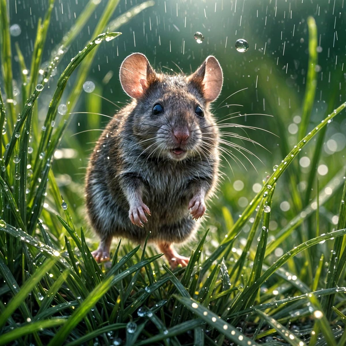 This image shows a detailed close-up of a mouse in grassy surroundings, enhanced by bright, cinematic lighting. Dew droplets add a hyperrealistic touch to the scene.