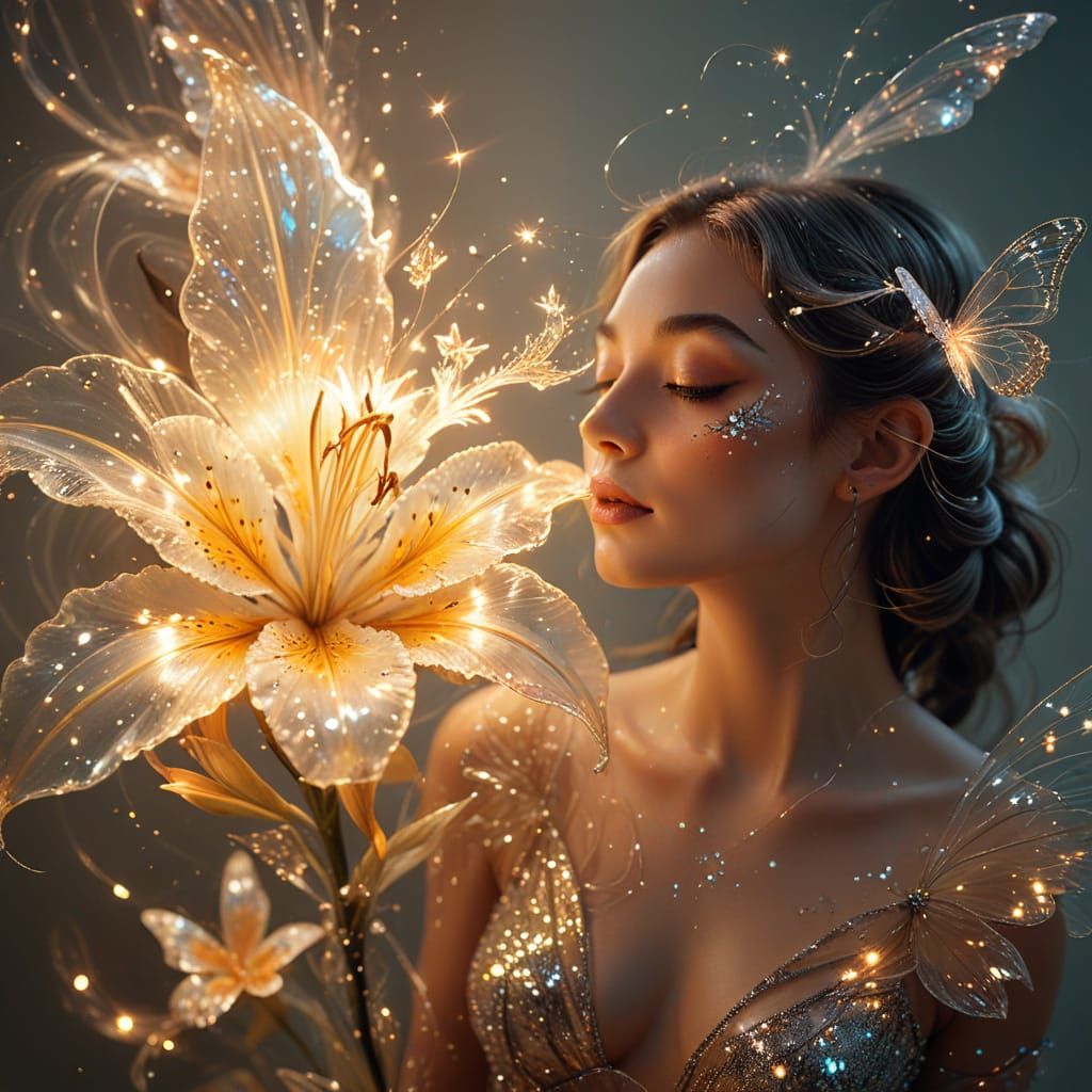 A surreal image shows a crystal tiger lily and an iridescent butterfly. The image features pastel colors, gold accents, and elements of the style of Salvador Dali.