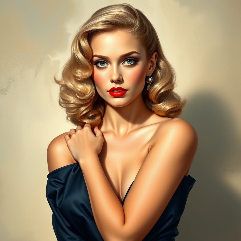 A full-body portrait of a stunning blonde woman evoking 1950s pin-up art. The image blends idealized naturalism with soft focus and textured backgrounds, reminiscent of classic oil paintings with an ultra-realistic, detailed style.