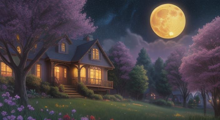 This image shows a small plane flying over a cozy neighborhood at night. The fantasy landscape features houses, trees, blooming flowers and a starry sky illuminated by a full moon, all rendered with warm golden hour lighting.