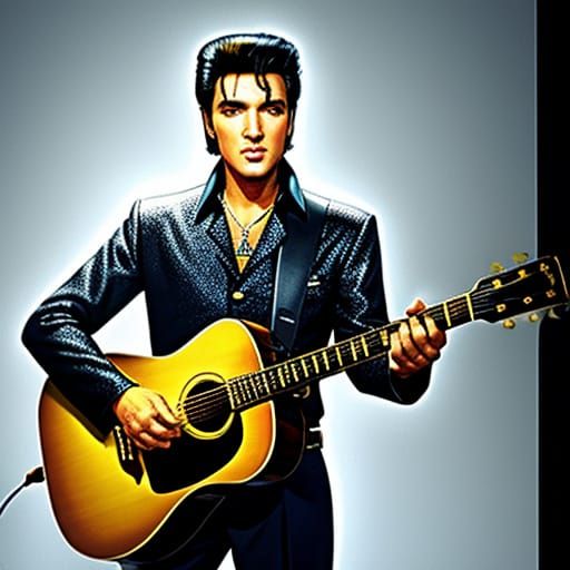 This image depicts a nostalgic scene of Elvis Presley sitting with his guitar, showcasing a classic rock 'n' roll aesthetic.