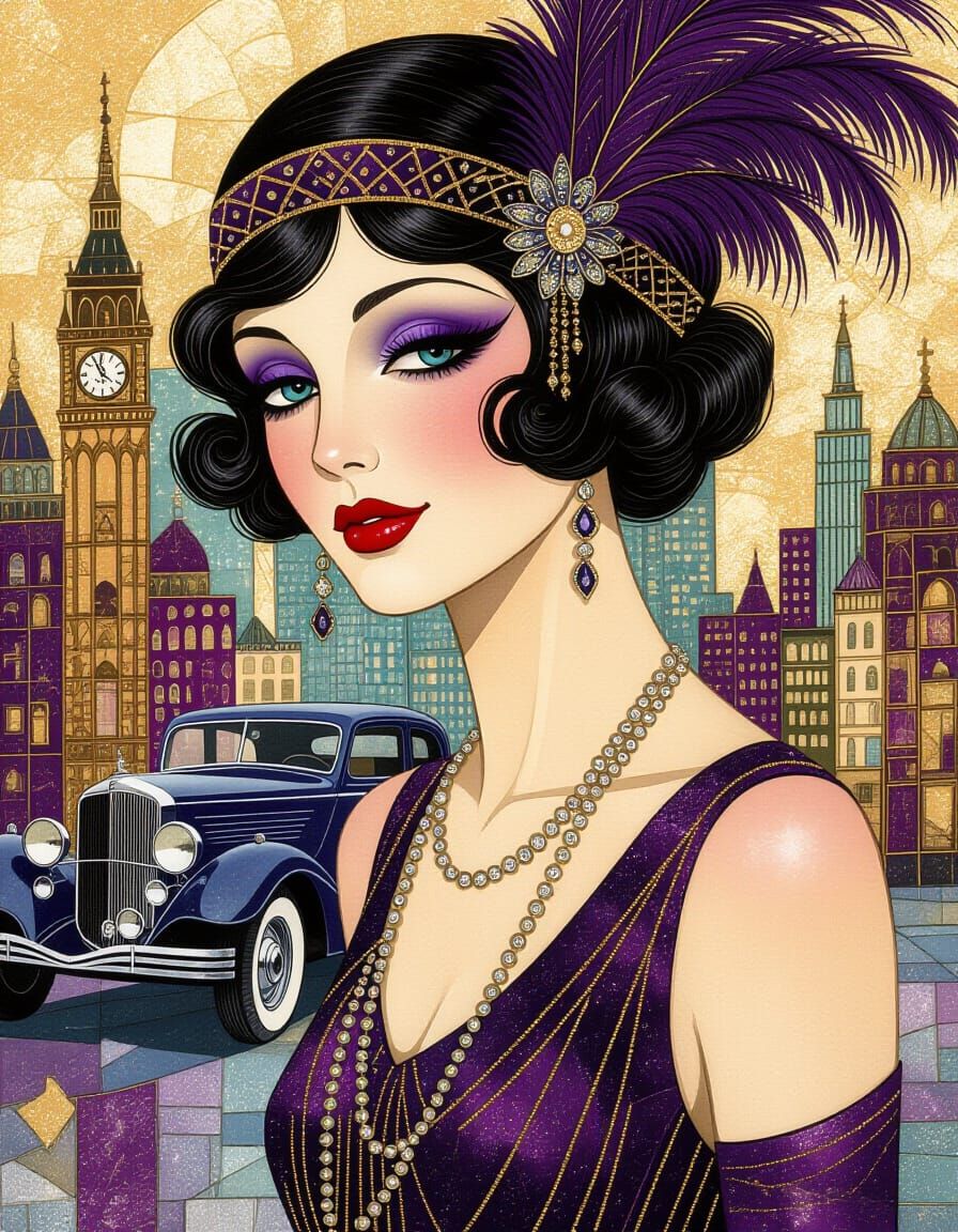 Generate unique art deco flapper and cabaret images with vintage cars and cityscapes. Free and easy AI image creation.
