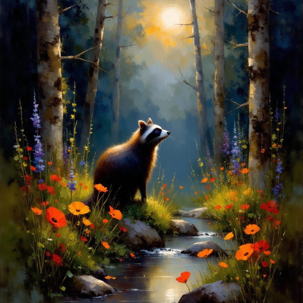 A surreal painting depicts a young raccoon near a stream on a moonlit night. The forest glows with vibrant colors in the style of impressionistic oil painting.