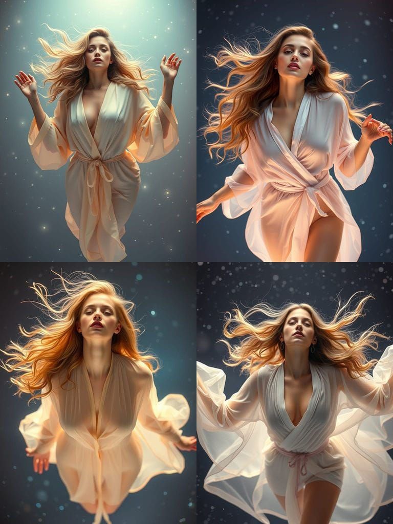This image shows a serene woman floating weightlessly, her golden hair and futuristic robe billowing around her. The soft, pastel lighting and holographic backdrop create a dreamy atmosphere.