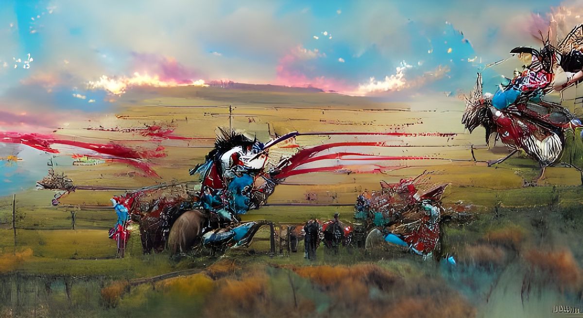 This image depicts the Battle of Little Bighorn with General Custer's Last Stand. US Cavalry and Native Americans clash amidst horses, rifles, and bows in a detailed and colorful digital painting.