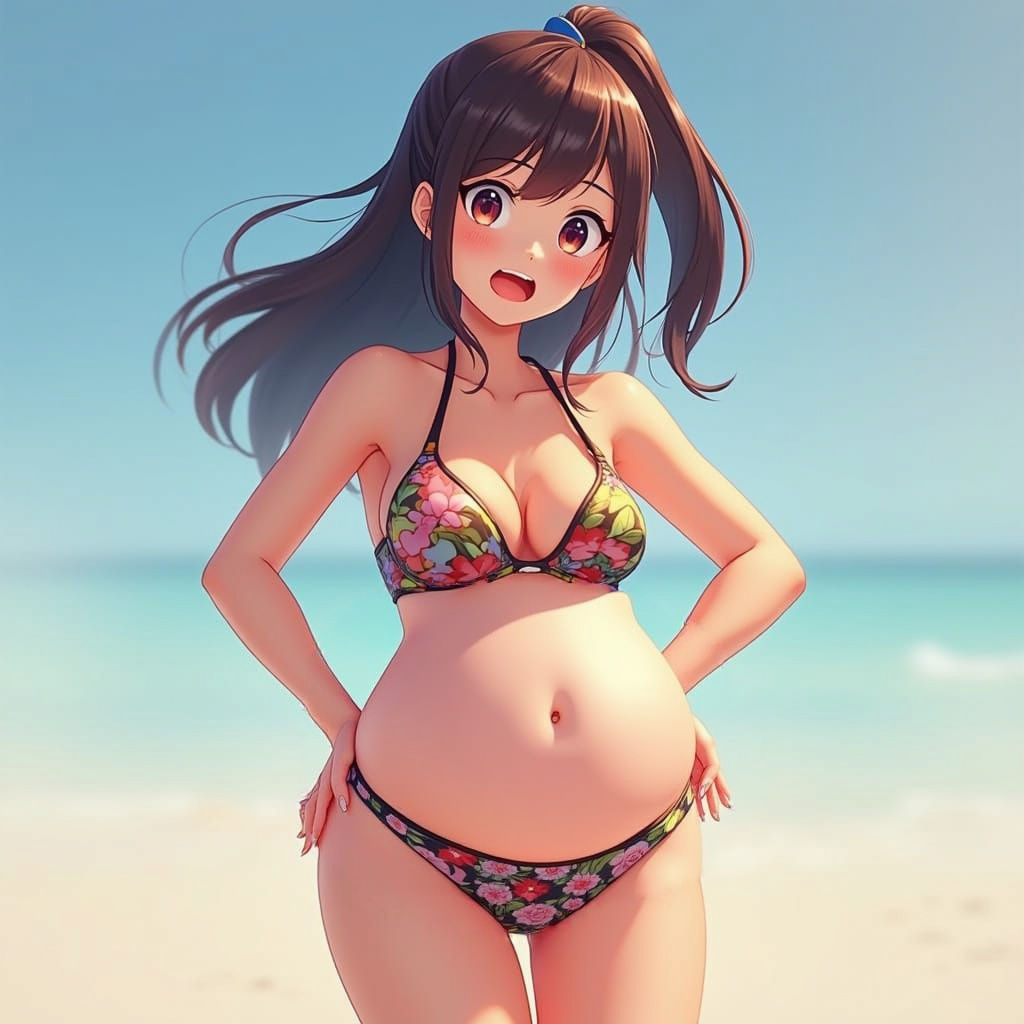 This image shows a young woman in a tight swimsuit with an exaggerated belly, exuding happiness and subtle concern. Created in 3D anime art style with ultrafine details and breathtaking visuals.