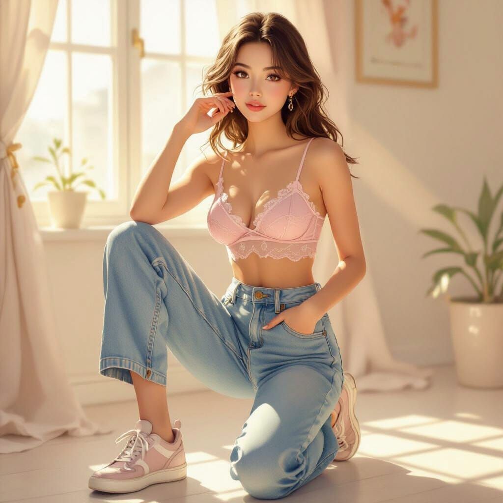 This image shows a girl in a pastel pink, lace-trimmed bra, high-waisted jeans and sneakers, posing in a sunlit room. The artwork is reminiscent of art nouveau with intricate details.