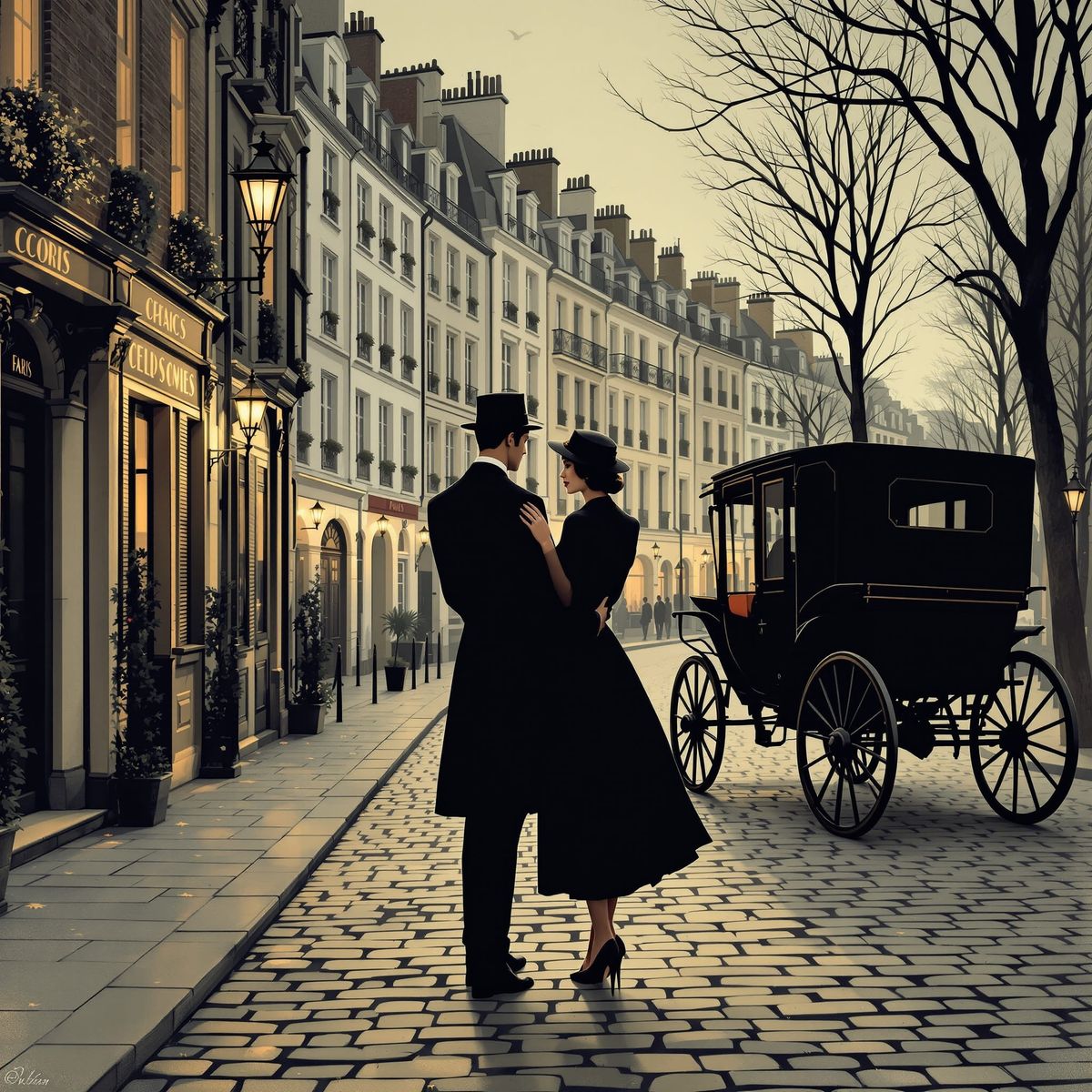 This image shows a couple in 1920s clothing on a Paris street. A carriage waits near the townhouses, captured with the muted colors and dramatic lighting of vintage fashion illustration.