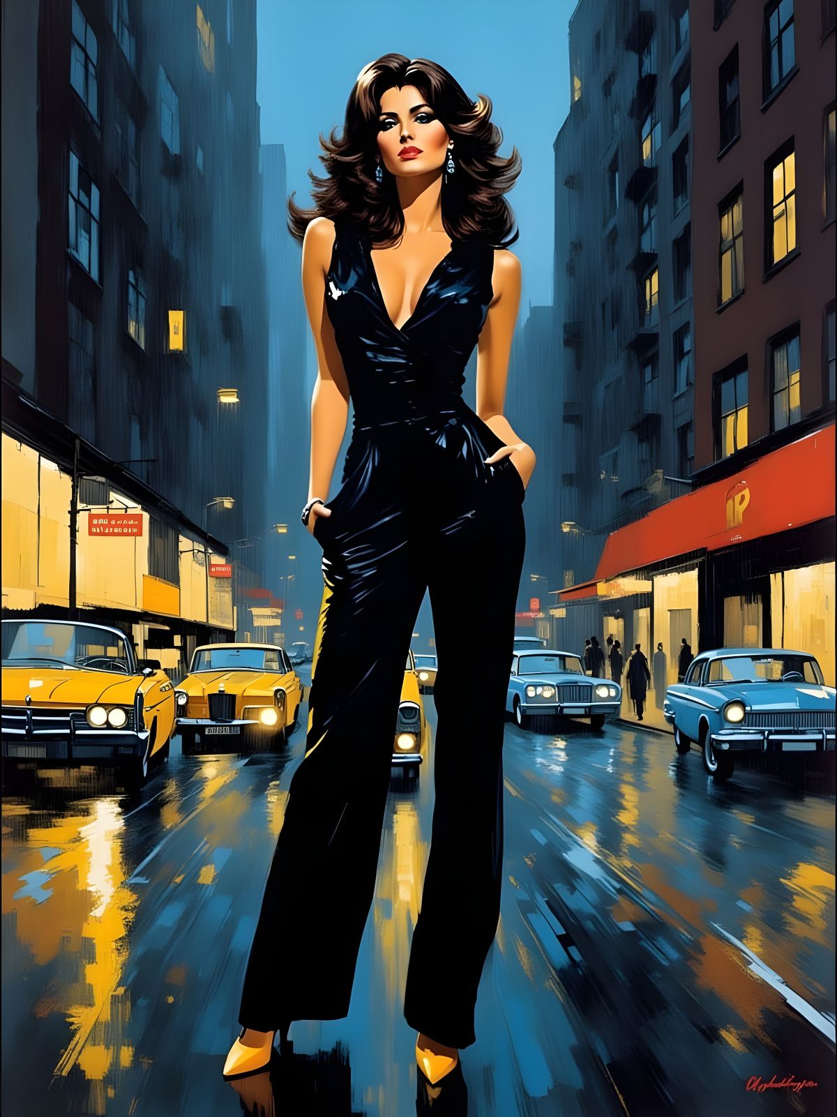 This image shows Raquel Welch as a femme fatale in a dark suit on a city street. The artwork is an abstract impasto painting with a vintage crime novel aesthetic.