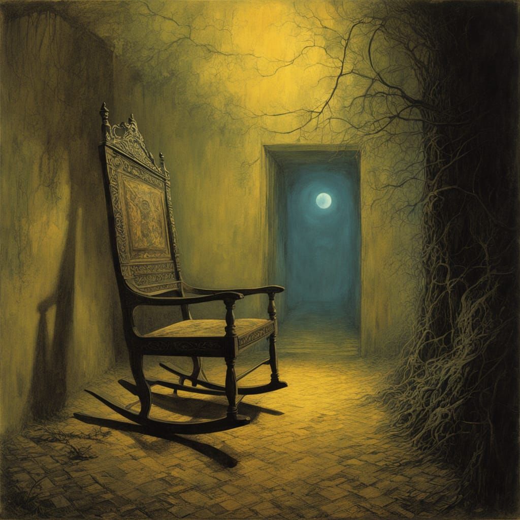A wide-angle shot of a haunted Victorian mansion porch features a vintage wooden rocking chair gently swaying in pale moonlight. Overgrown vines, geometric shapes, and a faint ghostly figure create an eerie, surreal scene in dark academia style.