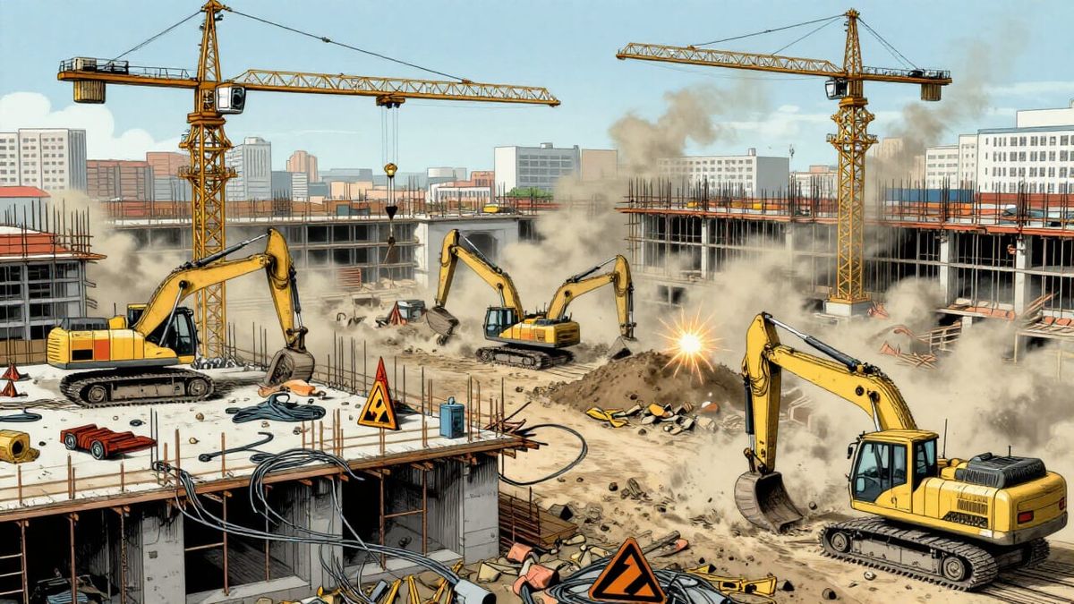 Construction site with visible and hidden hazards, open edges, moving machines, exposed wires, dust in the air, educational illustration