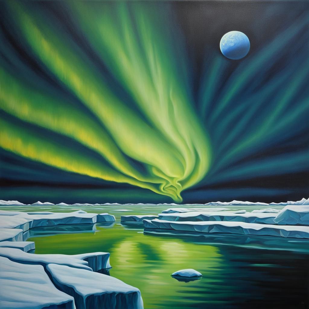 A hyperrealistic painting of the Arctic Ocean under the Northern Lights. The artwork features icebergs, a single moon, and evokes a sense of photorealism and surreal geometry.