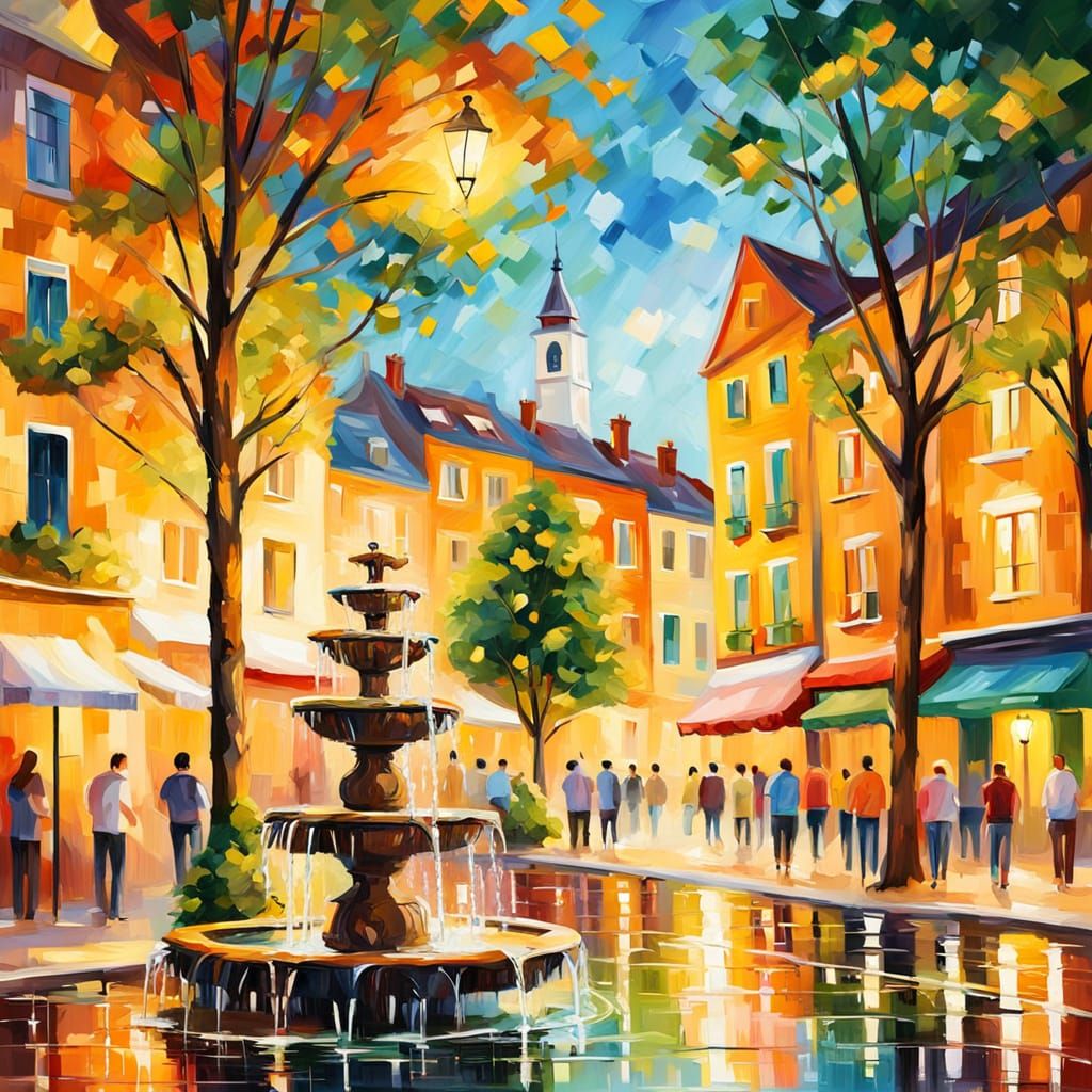 A vibrant painting of a fountain in a town square, surrounded by colorful buildings and lush greenery. The image is rendered with impressionistic impasto techniques and warm, golden light.