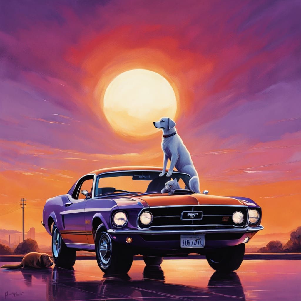 This heartwarming cinematic piece reimagines classic muscle car culture with a pet twist — a loyal golden retriever and a curious cat guarding a shining vintage Mustang at dusk. Blending nostalgia, warmth, and the love of adventure, it’s perfect for pet lovers, car enthusiasts, and NightCafe’s “Classic Muscle Car” challenge. Designed for SEO virality and engagement, targeting classic muscle car art, vintage dog and car photography, and retro cinematic pets.