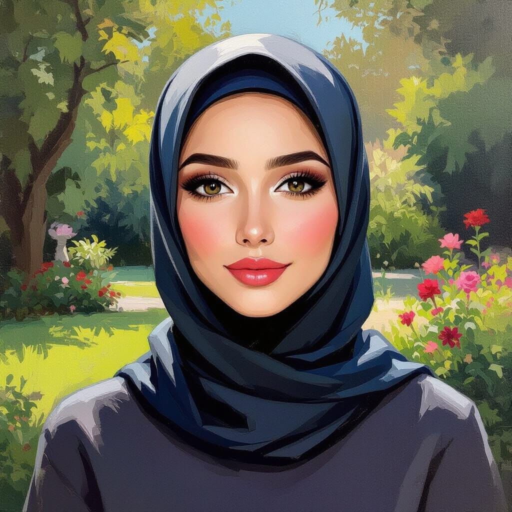 A minimalist oil painting of a beautiful woman wearing a hijab. The head and shoulders portrait features a subtle smile, set against a backdrop of a lush garden park.