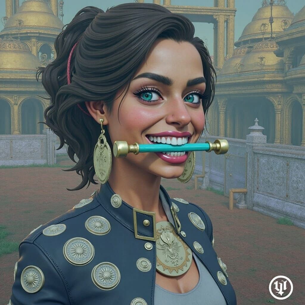 This image showcases a determined woman with a billy club wedged between her gritted teeth, set against a richly detailed fantasy environment reminiscent of atmospheric matte paintings. Deep, vibrant colors and nuanced lighting evoke a sense of drama and invitation to explore this captivating world.