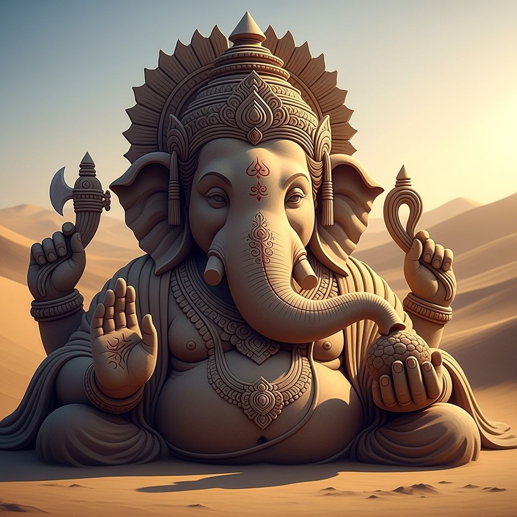 This image shows an intricate sand sculpture of Lord Ganesha in a serene desert setting. The sculpture exhibits a divine expression with warm sunlight and soft shadows, rendered with deep colors and fantastical elements.