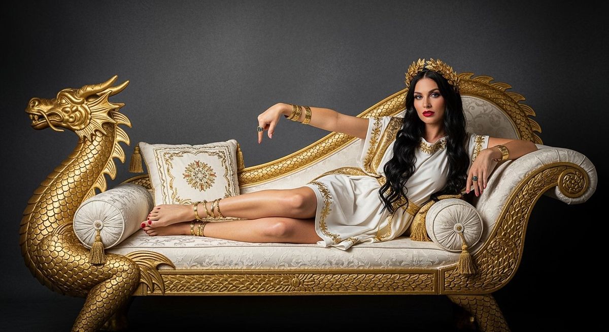This image shows a Roman Empress lounging on a dragon-shaped chaise longue. The portrait, reminiscent of high-fashion photography, uses natural light and bokeh for a sharp, luxurious aesthetic.