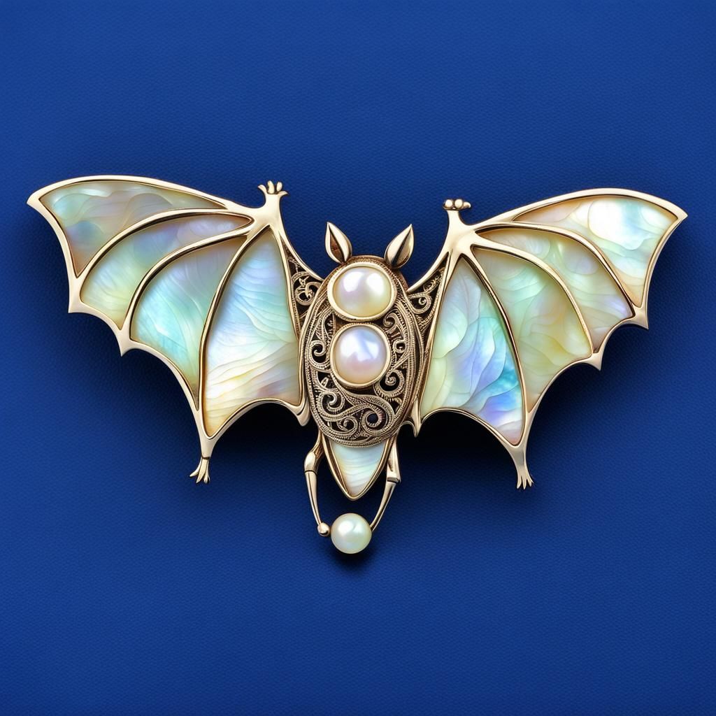 This image shows a bat-shaped brooch, intricately carved from mother of pearl and accented with delicate silver filigree. A beautiful example of detailed craftsmanship.