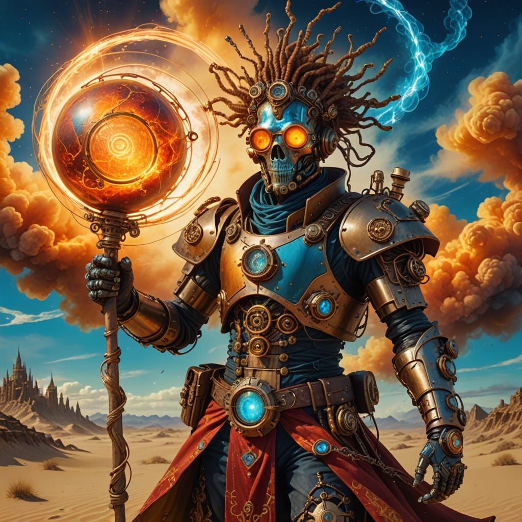 This image shows a full-body portrait of a steampunk cyborg sand wizard holding a stave with a glowing orb, rendered in vibrant alcohol ink style with swirling dust and golden light.