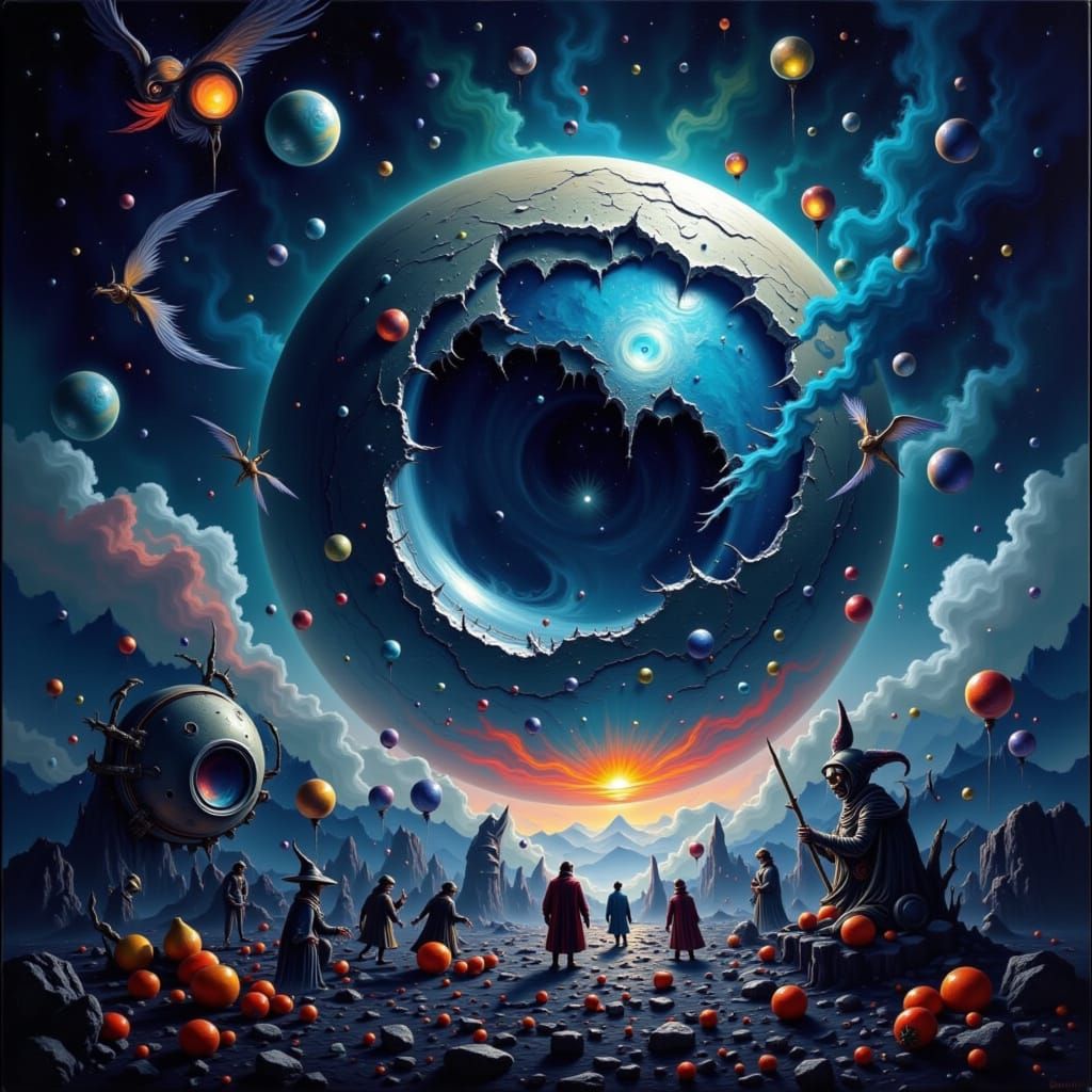 This image shows a surreal marketplace on a giant, crystalline moon. It features tiny merchants, glowing fruits, clockwork devices, and mechanical birds, rendered in a painterly, biomechanical fantasy style.