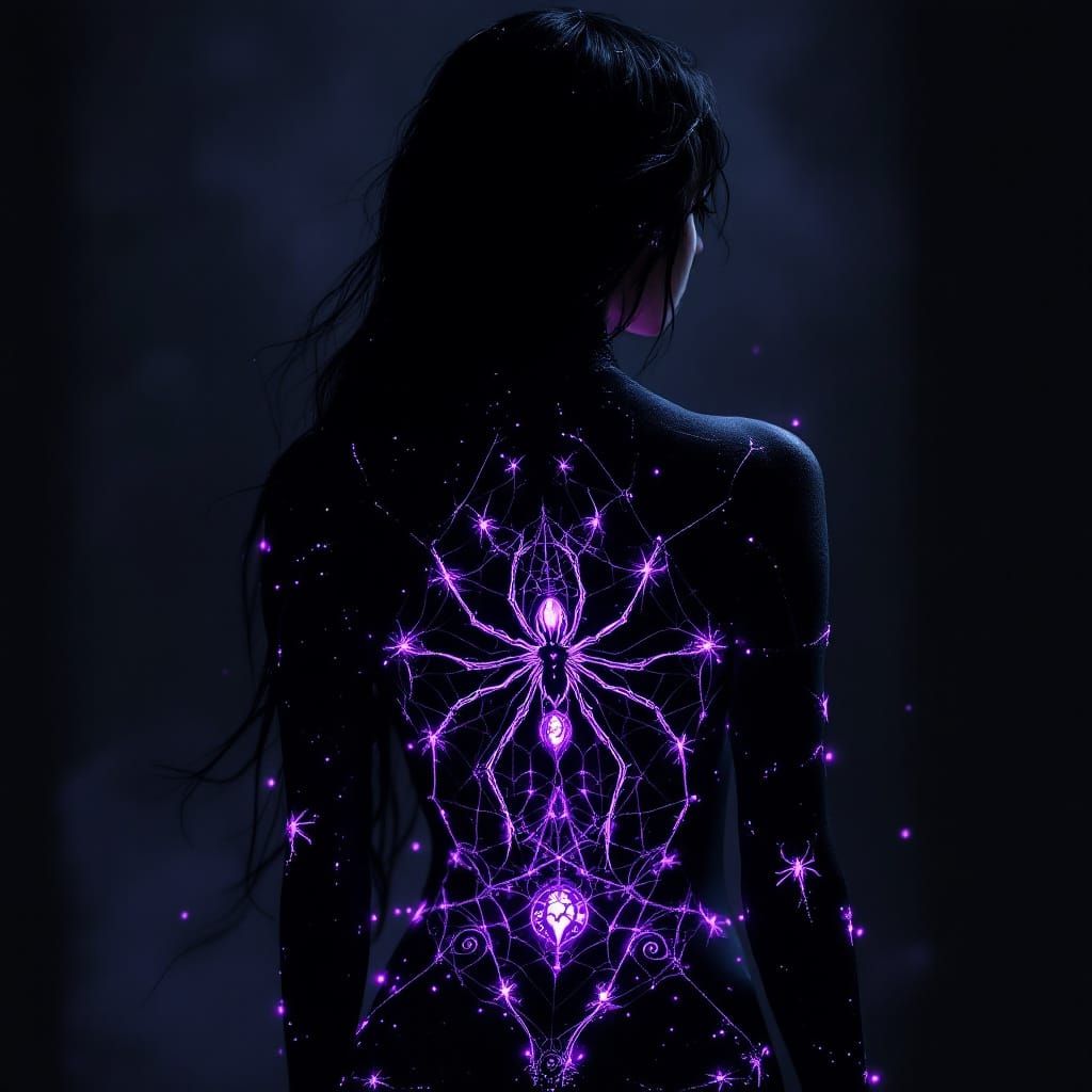 This image shows a Gothic woman in a spider web bodysuit with glowing purple and black rune tattoos. It features a dark, immersive background with swirling patterns, rendered with cinematic detail and atmospheric lighting.