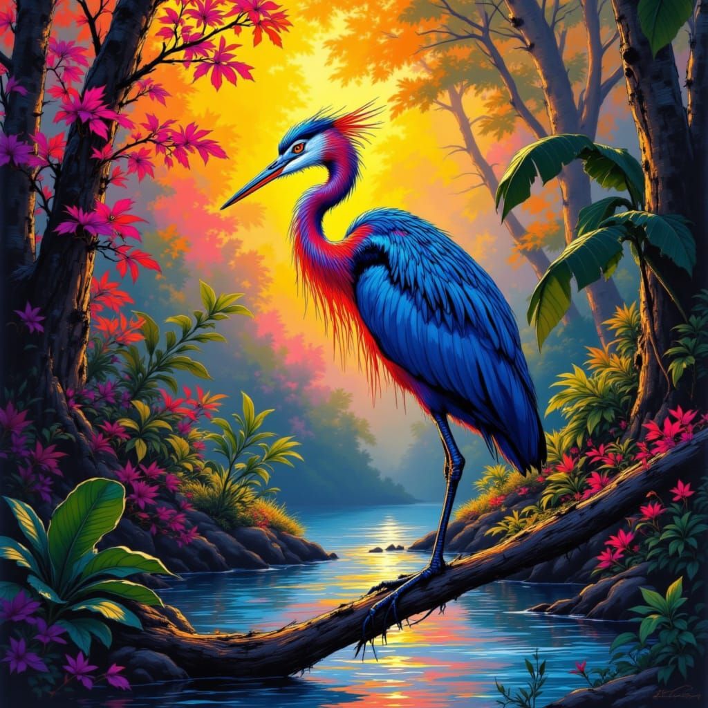 This image shows a stunning, hyper-saturated portrait of a heron in a lush tropical rainforest, with vivid colors and fantastical lighting, blending naturalistic fantasy with dreamlike richness